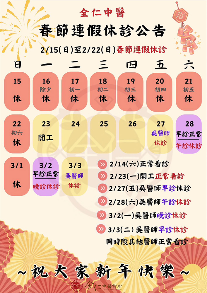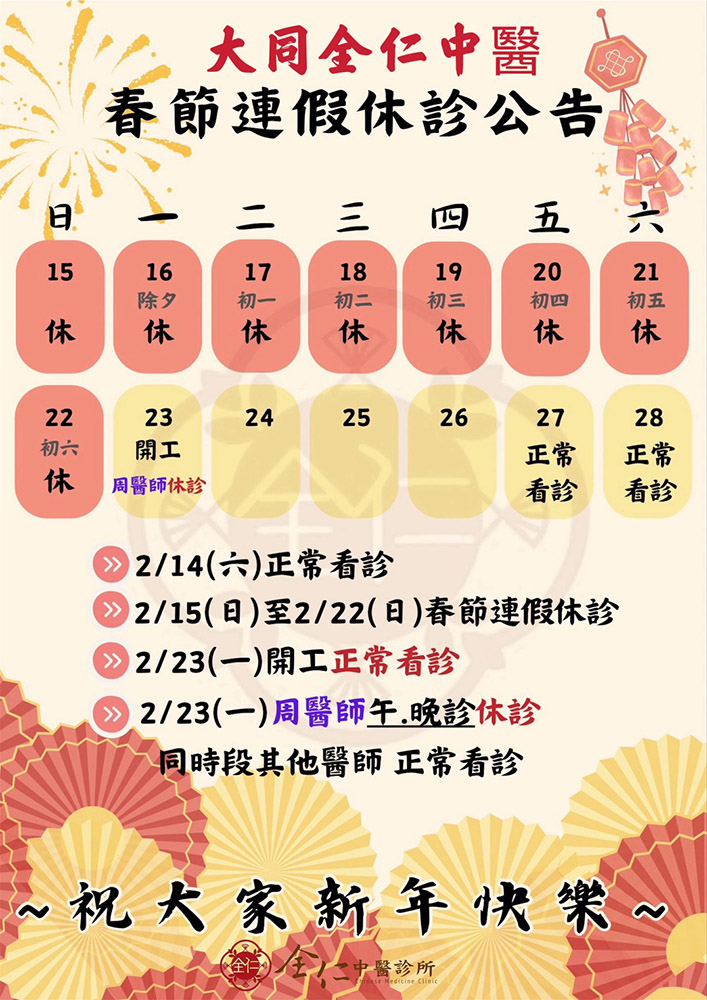 全仁中醫醫療體系|新春休診公告